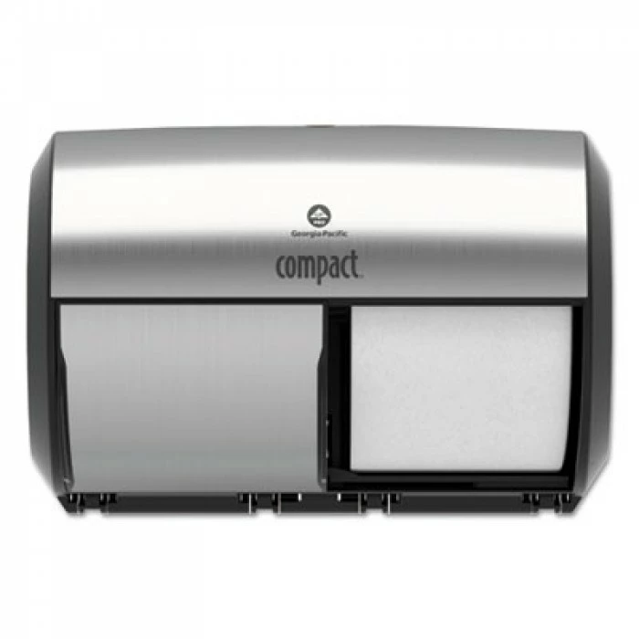 Compact Coreless Side-by-Side 2-Roll Dispenser, 11 x 7.4 x 7.4, Stainless Steel. High-capacity coreless tissue system dispenses up to 3,000 two-ply sheets of tissue, which is up to six times the capacity of single standard two-ply rolls while maintaining a professional look. Transfer paddle prevents access to new roll before current roll is completely used. See-through, high-impact plastic cover permits monitoring of paper supply. Holds up to two 5 3/4” diameter Compact® Coreless rolls (GEP-19375, sold separately). Locking dispenser prevents pilferage. For Roll Size: 3.85″ x 4.05″; Roll Type: Coreless; Capacity (text): Holds 2 Rolls; Color(s): Stainless Steel.