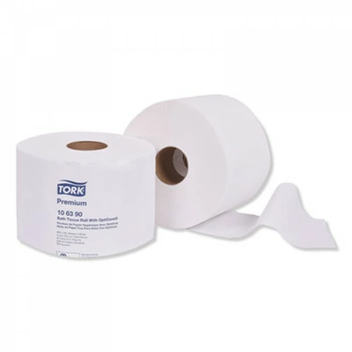 A must-have in high-traffic public restrooms, the Premium 2-Ply Bath Tissue Roll with OptiCore offers a unique combination of capacity, waste reduction, and quality. Featuring a 2-ply thickness and an attractive floral embossing pattern, this product is strong and highly absorbent, perfect for a variety of wiping tasks.